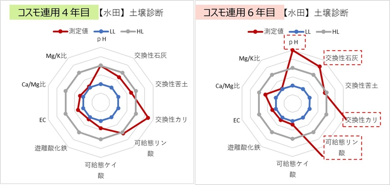 左側が4年目で右側が6年目の土壌診断なんだけど、4年目よりも6年目の土壌成分バランスが酷く崩れてしまっているの。